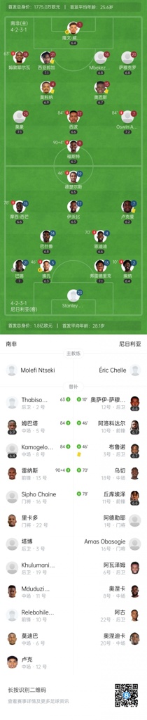 本场比赛,虽然身价7000万欧的奥斯梅恩伤缺,但尼日利亚全队身价仍有1.8亿欧,首发有伊沃比、卢克曼。比赛第25分钟尼日利亚后卫埃孔乌龙,第44分钟贝西破门,之后双方再无建树,最终战成1-1平。