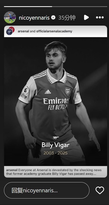 【相关新闻】因脑损伤去世阿森纳官方悼念前青训球员维加:他将永远被铭记